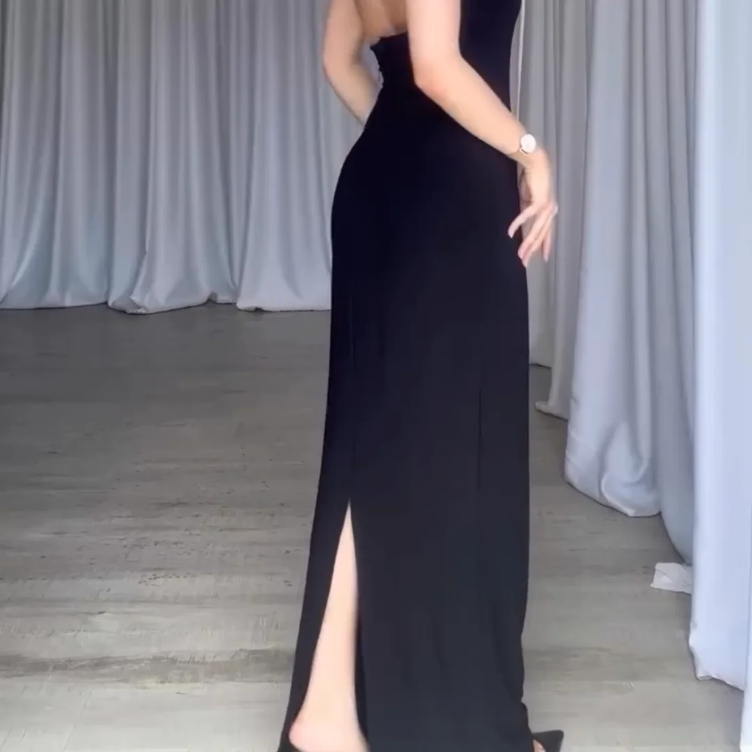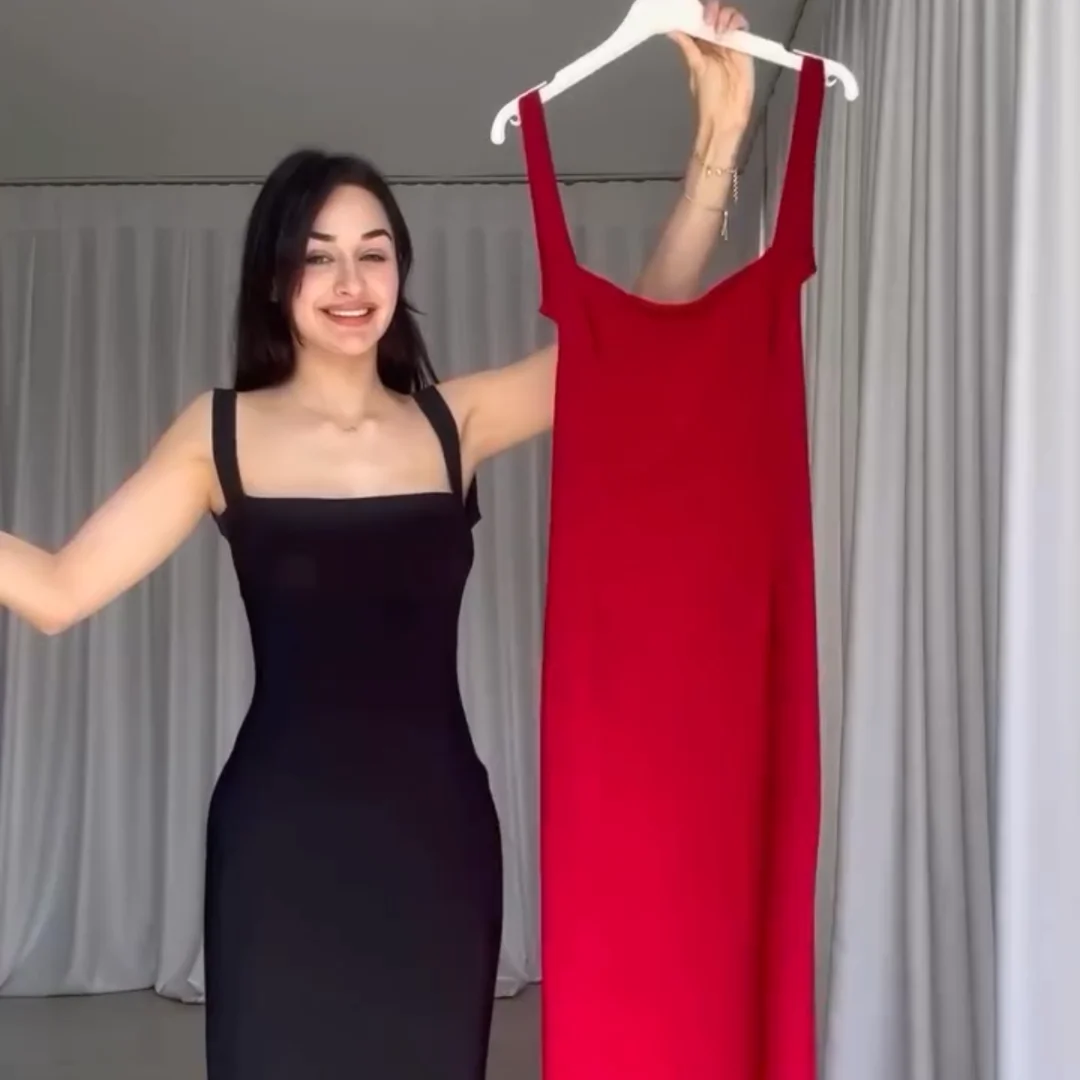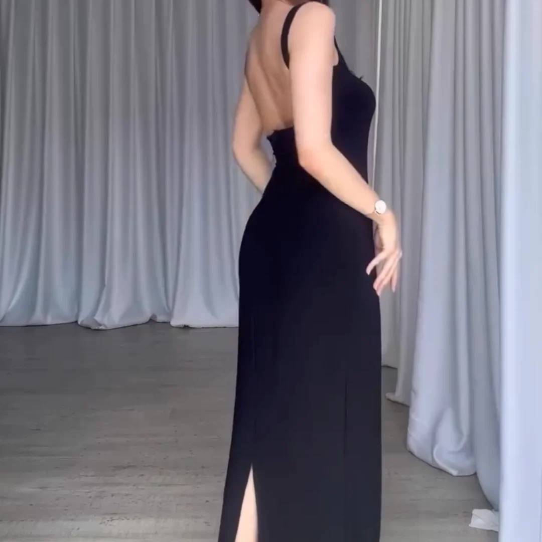 This backless bodycon dress has a stylish half cut at the back. Made from soft cotton spandex fabric, it’s comfortable and stretchy. The free size fits from 40 kg to 70 kg, offering a great fit for different body types. It’s perfect for a bold, fashionable look.