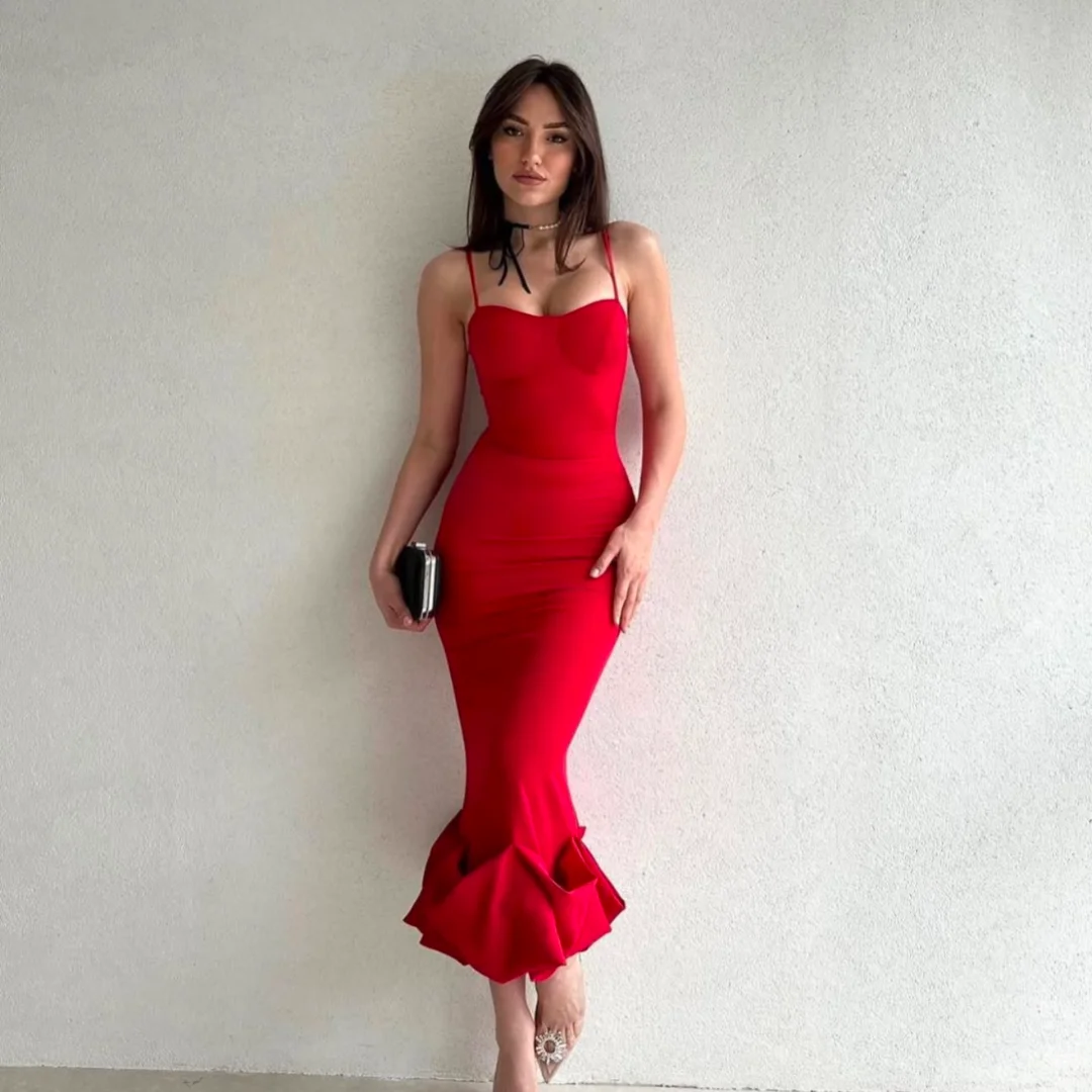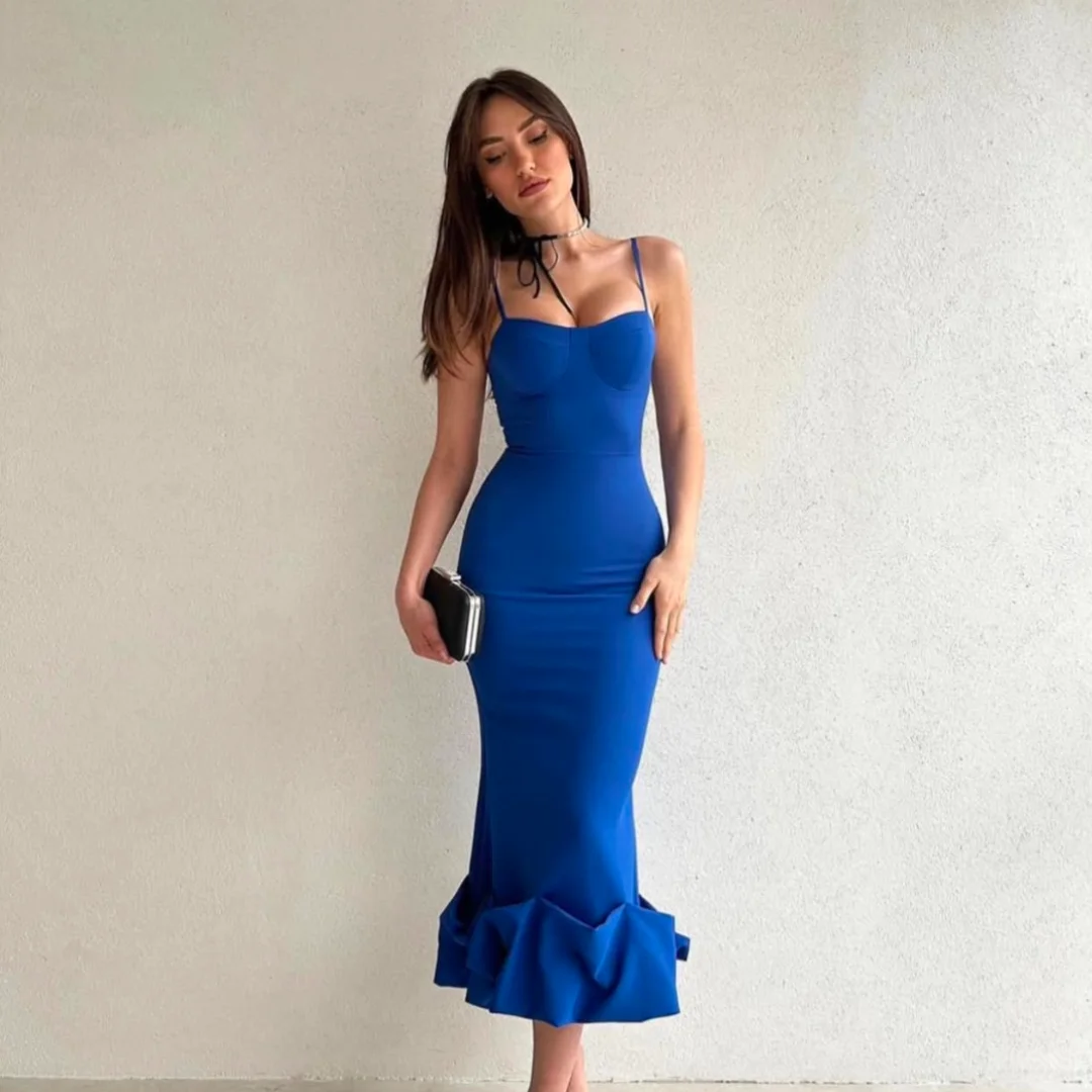 This elegant bodycon midi dress comes in white, black, red, and royal blue. Made from a spandex-cotton mix, it’s soft, stretchy, and fits weights from 40 to 70 kg. It features thin straps, a structured bust, and ruffle details at the hem. Perfect for parties and special occasions.